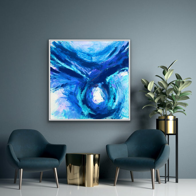Part of the Seafoam Collection, “Seafoam Blue Hole” draws its mystery from the Great Blue Hole of Belize, where the sea opens into a vast, silent void. This 48 × 48 inch mixed-media work—layered with deepening blues and South Beach sand—creates a textured descent that feels both beautiful and unsettling, pulling the viewer toward a hidden world beneath the surface where light falters, shadows breathe, and the unknown quietly waits
